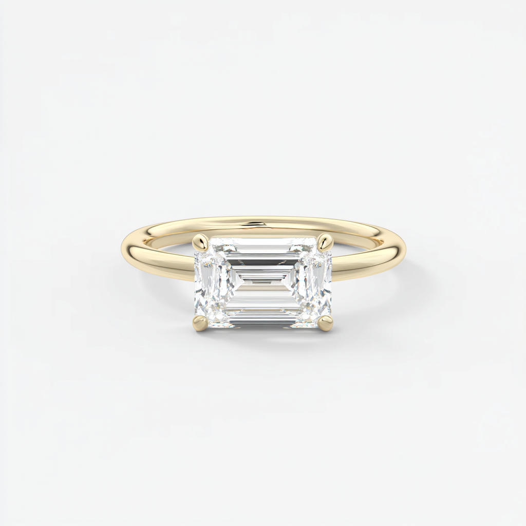 The Harriet engagement ring sounds like a stunning and contemporary take on the classic solitaire ring! Its signature east-west design, featuring a beautiful emerald cut stone set in a modern 4 claw setting, introduces a fresh and directional appeal to the traditional ring style. The choice of the emerald cut stone adds a touch of sophistication and elegance to the design, while the polished band enhances the overall simplicity and refinement of the ring. Harriet is a fine example of modern simplicity at its best, making it a perfect choice for someone who appreciates clean lines and contemporary aesthetics in their jewelry.