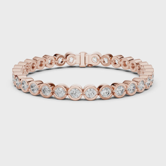Valencia redefines contemporary elegance through clean lines and seamless symmetry. Each round brilliant diamond is bezel-set in polished gold, offering a modern interpretation of the classic tennis bracelet.